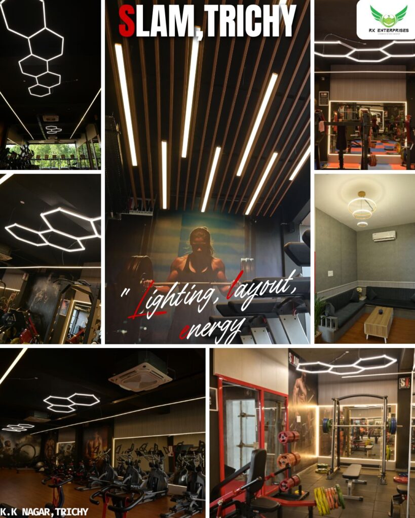 As the best interior designer in Trichy, RK Enterprises has recently completed full interior fit-outs for Slam Fitness Center in all three major branches: KK Nagar, Puthur, and Karumandabam. Each location showcases RK Enterprises’ mastery in contemporary design and architectural lighting, tailored for wellness environments.